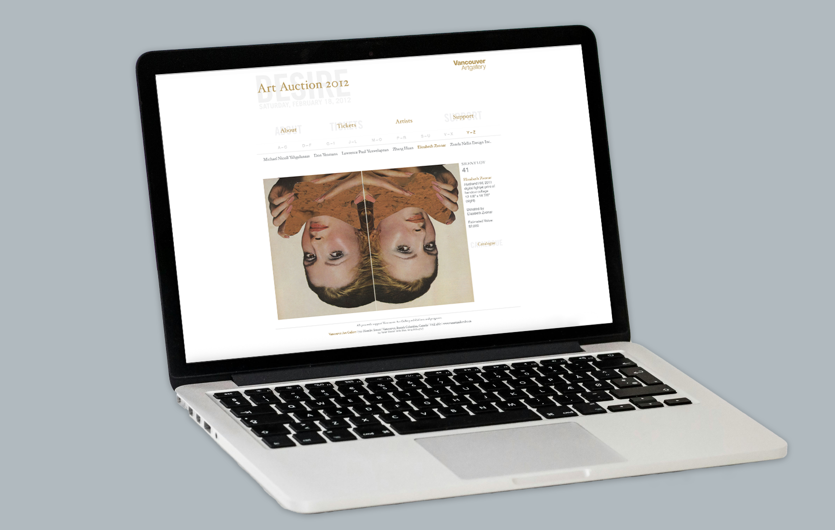This was the online auction catalogue and event site for the 2012 Vancouver Art Gallery Auction and Gala, Desire. I created a simple HTML microsite to showcase the works up for auction, provide ticket pricing and event information, recognize sponsors, and present the auction catalogue, which included trips and other luxury items. The Vancouver Art Gallery Art Auction is the Gallery’s signature annual fundraising event, designed to engage the public and secure donor support. Proceeds from the event support the Gallery’s exhibitions and programs.